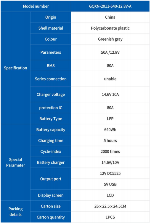 The dimensions of the 12.8V 50Ah lithium battery are 250*220*240 mm, and the weight is ≤ 6.4 kg, providing 640Wh of energy. The casing material is PC, which is waterproof.