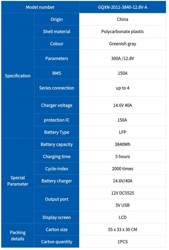 12.8V 300Ah LiFePO4 Battery 3840Wh GQXN-2011-3840-12.8V-A