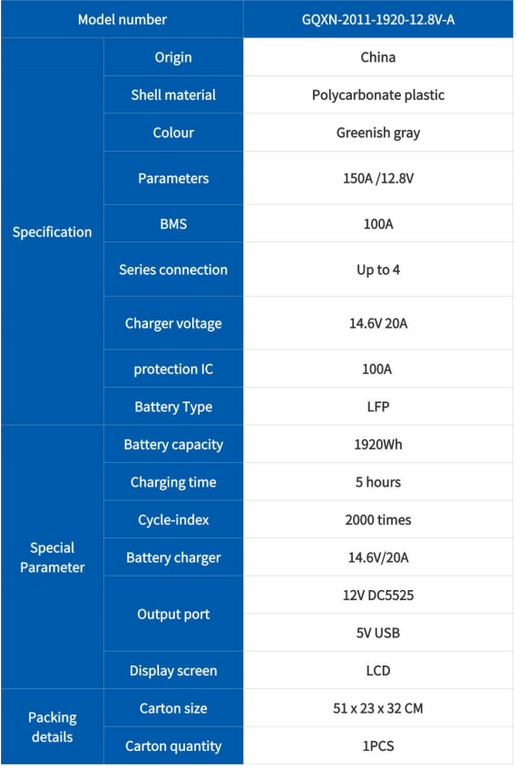 12.8V 150Ah LiFePO4 Battery 1920Wh GQXN-2011-1920-12.8V-A